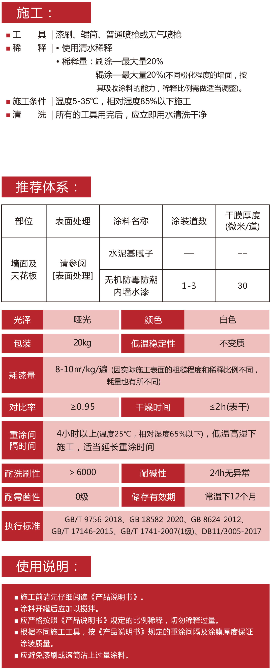 無(wú)機防霉防潮內墻水漆采用優(yōu)質(zhì)無(wú)機硅酸鹽為主要成膜物質(zhì),輔以?xún)?yōu)質(zhì)顏填料配制而成,可達到A級耐燃等級要求。具有優(yōu)異的抗菌防霉性、耐堿性等特點(diǎn),是一種新型的內墻環(huán)保產(chǎn)品。